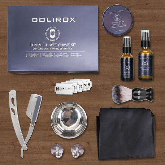 Shaving Kit for Men, Includes Straight Razor for Men, Shaving Cream, Pre Shave Oil, after Shave Balm for Men, Shaving Brush and Bowl, Beard Apron Bib