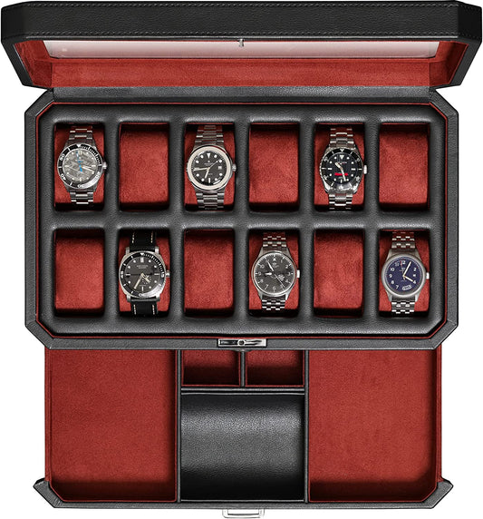 12 Slot Leather Watch Box with Valet Drawer - 12 Slot Luxury Watch Case Display Organizer, Microsuede Liner, Mens Accessories Holder, Jewelry Case, Jewelry Display Organizer (Black/Red)