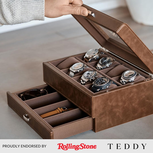8 Slot Watch Box with Storage Drawer – Premium Watch Storage Case for Men | 2.2-Inch Wide Pillows Hold Small & Oversized Watches (Brown)